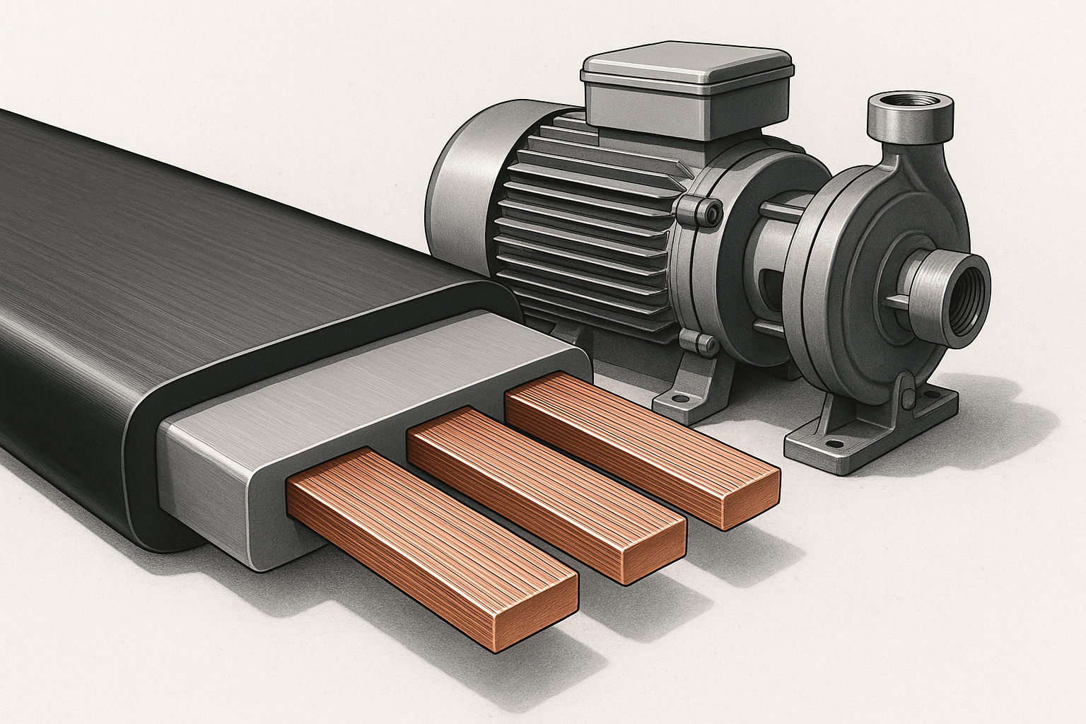 Typický plochý kabel čerpadla se skládá ze tří vrstev: vodičů, izolace a vnějšího pláště nebo pásky. Vodiče jsou obvykle lankové měděné, aby kabel zůstal pružný při zachování vodivosti. Izolační materiály se liší podle požadavků na teplotu a chemickou expozici. Běžnými volbami izolace jsou polyvinylchlorid (PVC) pro hospodárnost, termoplastický elastomer (TPE) pro lepší flexibilitu a zesíťovaný polyethylen (XLPE) pro vyšší teplotní odolnost a odolnost proti oděru. Vnější plášť nebo páska mohou být polyesterové, polyuretanové nebo PVC s adhezivním podkladem, zvolené pro odolnost proti oděru, oleji a vodě.
